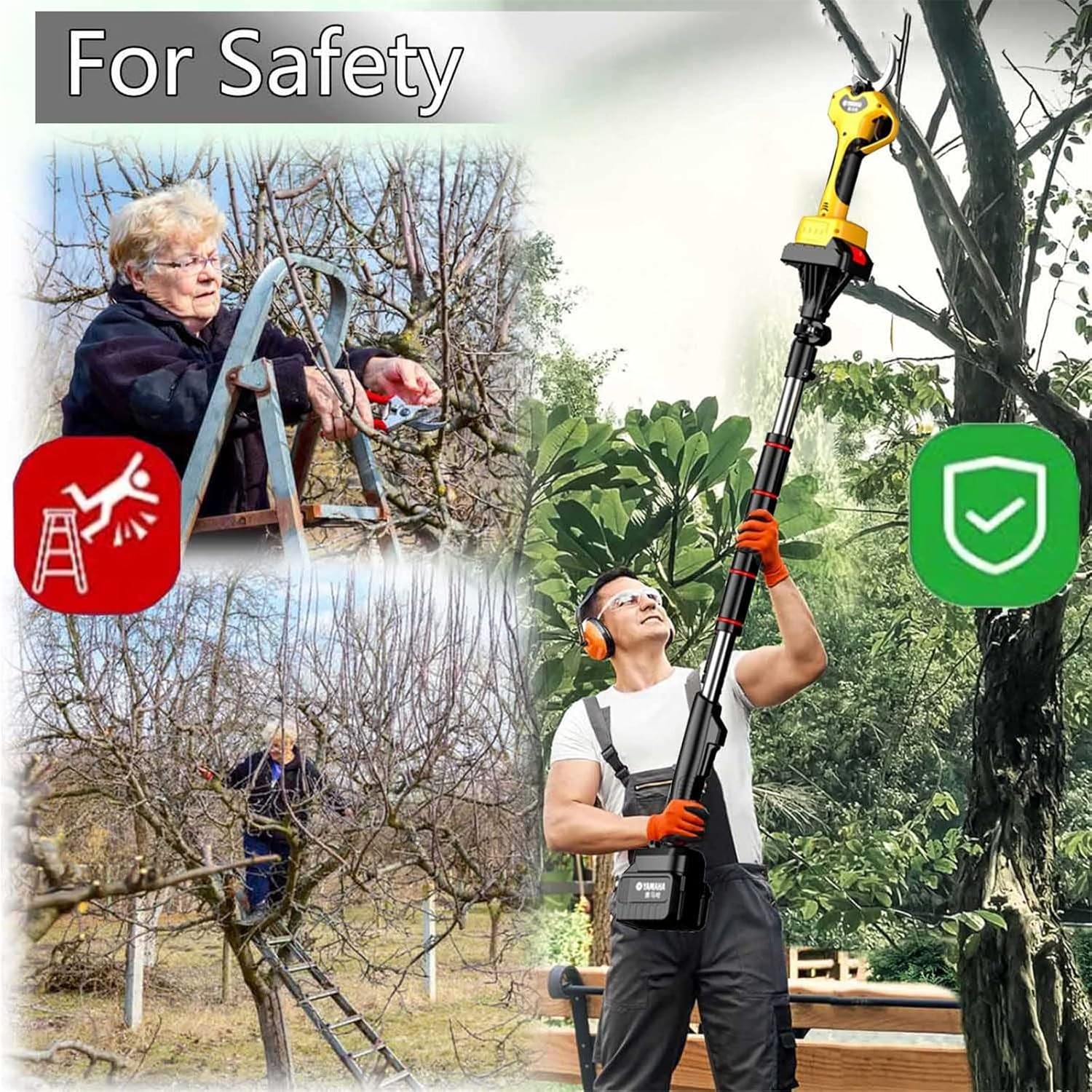 Introducing the upgraded electric branch shears, designed for professional wireless pruning that ensures fast and efficient cutting. The extension rod is expertly crafted for comfort, safety, and convenience, allowing you to easily reach high branches.Product Information:Name: Electric ScissorsColor: YellowBlade Material: SK9 Carbon SteelCutting Capacity: 0-60mmMaximum Cutting Diameter: 50mm (1.96in)Weight: 0.9kgCharging Voltage: 110-240VPower: 650WCharging Time: 1-2 hoursLong Load Time: 50 hours without sintering machineRunning Time: 10-12 hoursBattery Life: 248000 hoursExtension Rod Length: Adjustable 130-200CMPower Display: Equipped with a power display screen for monitoring battery levels.Packing List:Trimming Scissors x 1Extension Rod x 1Hand Saw x 1Storage Box x 1Original Blades x 2Charger x 1Batteries x 2Tool Box x 1Wrenches x 2Grinding Stone x 1Work Cap x 1Bodypack x 1Safety Features:Please note that our pruning shears include safety protection. To initiate normal operation, press the trigger twice in quick succession to prevent accidental activation.Gear Adjustment:When the machine is on, switch between different speeds by hearing a 'drip sound' each time you press and hold the trigger.Safety Instructions:Ensure safety when using the blades. It is advisable to wear cut-resistant stainless steel gloves. Avoid contact with the blade while it is active, and keep the device out of reach of children and minors.