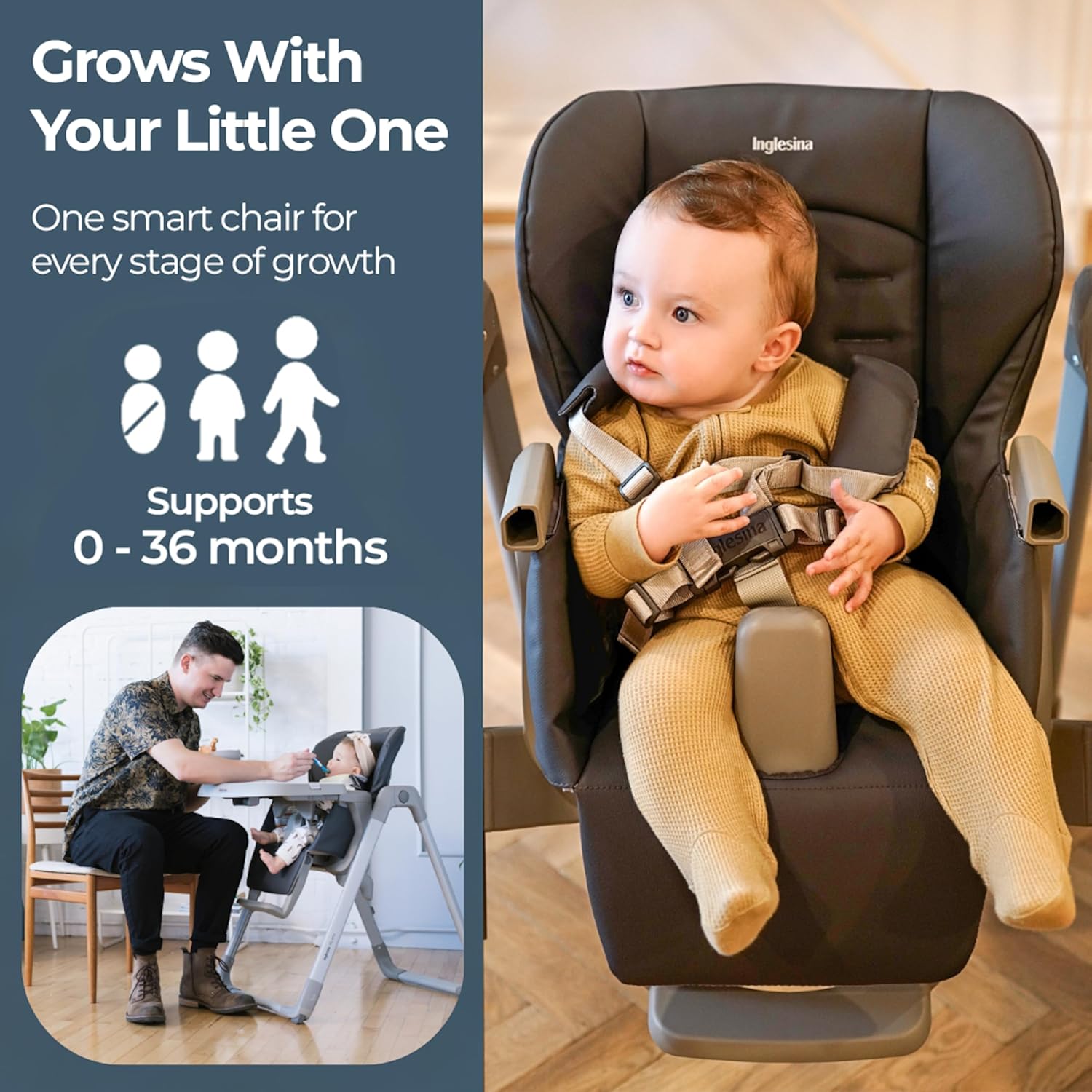 "Inglesina, Italy’s leading premium baby gear brand since 1963, known for high-quality strollers and highchairs, has crafted the My time High Chair to support your child from birth to 36 months. Designed with both comfort and versatility in mind, My time features a 3-position ergonomic backrest and adjustable footrest, providing ideal support as your baby grows. Its 4-position height adjustment accommodates any table height, allowing you to sit comfortably without straining during meals. Meal times can be messy, but My time’s leatherette seat makes cleanup simple—wipe it with a sponge or pop the dishwasher-safe tray cover in to clean. This compact, foldable high chair stands upright when collapsed, keeping your dining area organized and tidy. For added convenience, My time has a removable padded lining for hand washing, rear wheels for easy mobility, and multiple adjustable settings for both tray and back straps. With an elegant, gender-neutral design, My tme is the perfect combination of functionality and style for modern families."